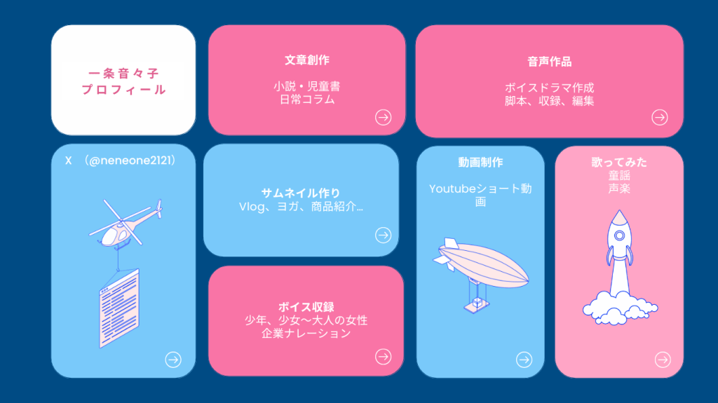 ナレーション、キャラボイス、歌、ブログ、サムネイルデザイン……